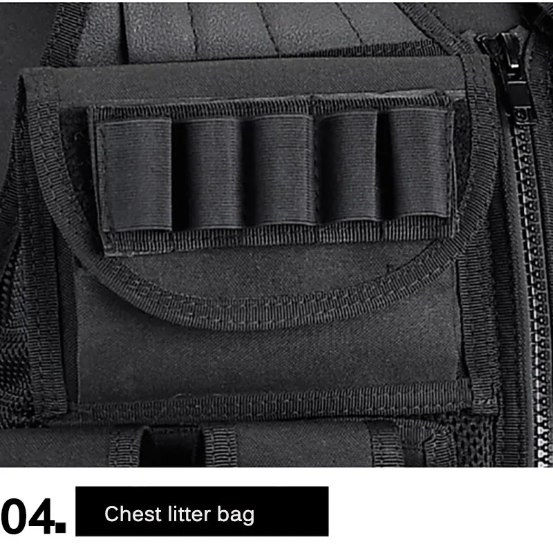Our vest has 3 rifle magazine pouches, 3 small equipment pouches, 1 pistol holster, 1 flashlight pouch, 1 inter phone pouch, 1 accessory pouch, 1 removable bullet holder, 1 phone pouch, 1 interior mesh pocket for hydration bag and 2 internal document pouches.
