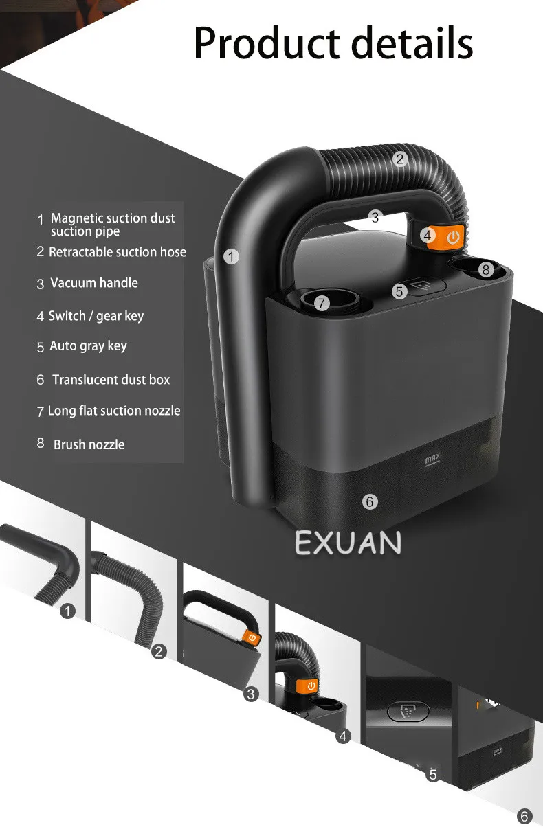Модель: wx030 Название продукта: Беспроводной автомобильный пылесос Номинальное напряжение: 20 в Номинальная мощность: 180 Вт Максимальное всасывание: 10 кПа Конструкция присоска: 2 шестерни Срок службы каждой передачи: 20 минут в стандартной передаче; 10 минут в высокой передаче Время зарядки аккумулятора: 1 час Дополнительный Калибр/внешний диаметр шланга: 32 мм Длина шланга: ≥ 330 мм Коэффициент расширения шланга: 1:4 Сбора пыли Вместимость: 0,2 литров Фильтрация воздуха на входе: циклонный воздушный поток + металлический фильтр + HEPA Воздушный фильтр: губка Рабочий объем: стандартный файл <65 децибелов/76 децибелов (уровень звука) Высокоскоростная передача <70дБ/81дб (уровень звука) Вес: 1,8 кг (включая насадку/шланг/аккумулятор) Размер: 150*182*218 мм Максимальная мощность всасывания: ≥ 30 Вт Настоящий вакуум (конец шланга): 10 кПа Максимальный поток: ≥ 10 л/сек
