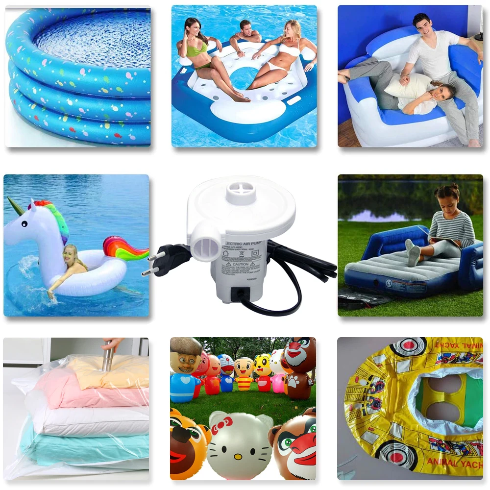 Широкое применение --- с высокой мощностью, быстрой заливкой и большим потоком воздуха, хорошо работает с воздушными матрасами, поплавками для бассейна, плотами, воздушными диванами, воздушными кроватями, ванной, лодкой, игрушками для бассейна, плавательные кольца и т. Д. Устройство также хорошо подходит для воздушного матраса запасного насоса или домашнего вакуумного сжатого мешка.