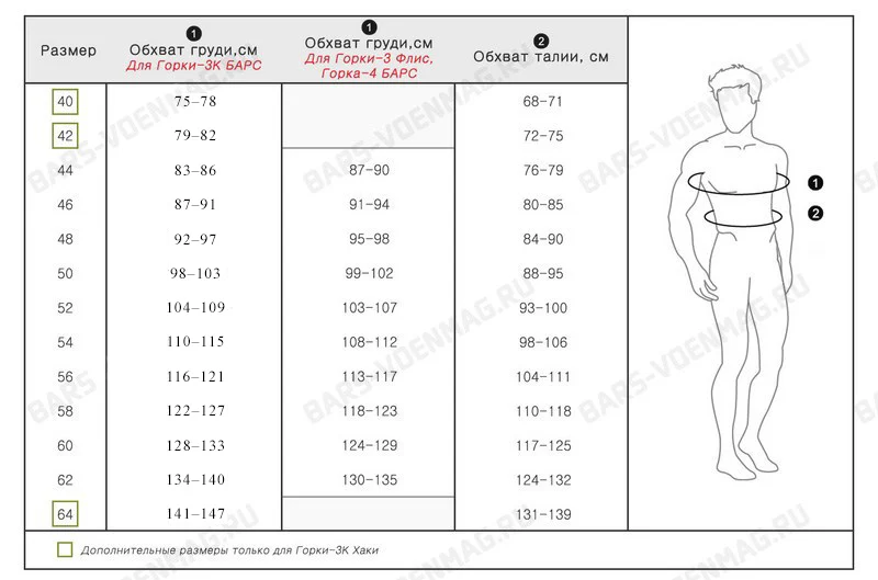 Покрой Не забывайте, что костюм свободного кроя. Это значит, что он не будет приталенным. Возможно, что вам даже покажется, что он великоват. Но если вы выбирали размер по нашим таблицам, то размер вы подберёте правильно. У Горки брюки носятся на талии (на уровне пупка). Если вы принципиально носите брюки только на бёдрах, то костюм Горка вам не подойдёт. Все размеры у Горки разработаны под типовую фигуру. Все мы разные и у каждого из нас есть свои индивидуальные особенности, из-за которых в редких случаях подобранный по таблицам размер может сидеть на вас не так, как вам бы того хотелось. Костюмы продаются комплектом (брюки + куртка + в некоторых моделях подтяжки). Взять куртку одного размера, а брюки другого нельзя. Размер При подборе размера обхват груди отвечает за посадку куртки костюма, а талии - за брюки. Что это значит? Если по обхвату груди вам подходит 52й размер, а по талии - 54, то нужно брать 52, т.к. в брюки вшита резинка и разницы в 1 размер вы не почувствуете. Если же разница между подходящим вам размером куртки и брюк 2 и более порядка (скажем, 52 куртка и 56 брюки), то рекомендуем вам взять размер посередине. Но при этом вы должны понимать, что куртка будет немного велика. Если же по груди вам подходит 52, а по талии 50, то нужно брать 52, но учитывать, что брюки могут сидеть не очень плотно. В костюмах «Горка» в комплекте идут подтяжки, которые вас всегда выручат. Если, к примеру, у вас обхват груди 108 см (для Горки-3К это 52й размер, грудь 108-112 см, талия 93-100 см), то костюм будет сидеть на вас свободно, под него можно будет поддеть тёплые вещи. Если же обхват груди 112 см и вы планируете поддевать тёплые вещи, то лучше взять не 52-й размер, а уже 54. Если под низ надевать ничего не планируете, то в этом случае можно смело брать 52-й. Учитывайте этот нюанс, если ваш обхват груди находится на границе между размерами.