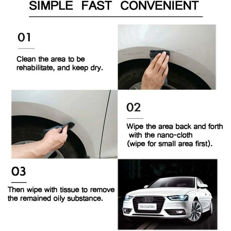 * Нанотехнология для ремонта автомобильных царапин: ткань для ремонта автомобильных царапин может эффективно удалять мелкие царапины и пятна автомобиля, восстанавливает цвет автомобиля и защищает поверхности краски.