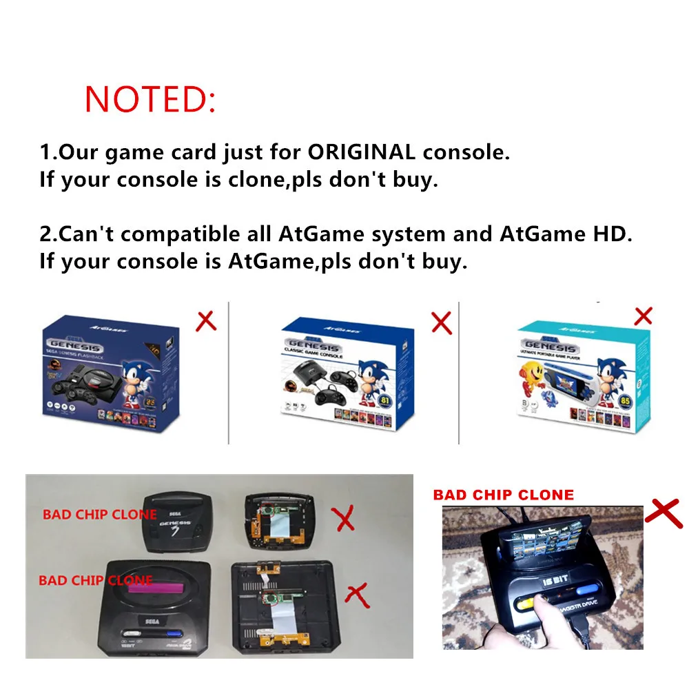 Не подходит для имитации машины. ATGames системы не будут работать. Не может работать на консоли клона bad chip. Проверьте консоль. Если ваша консоль клонирована, сначала проверьте внутренние чипы. (Консоль Bad clone не может запускать этот игровой картридж. Тогда нельзя запускать этот картридж, можно увидеть только меню, не запускать какую-либо игру или просто Запускать одну игру)