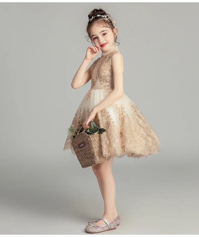 Детское платье принцессы Свадебные платья для девочек вечернее платье без рукавов для девочек платье с золотыми блестками нарядное платье для крещения для маленьких девочек