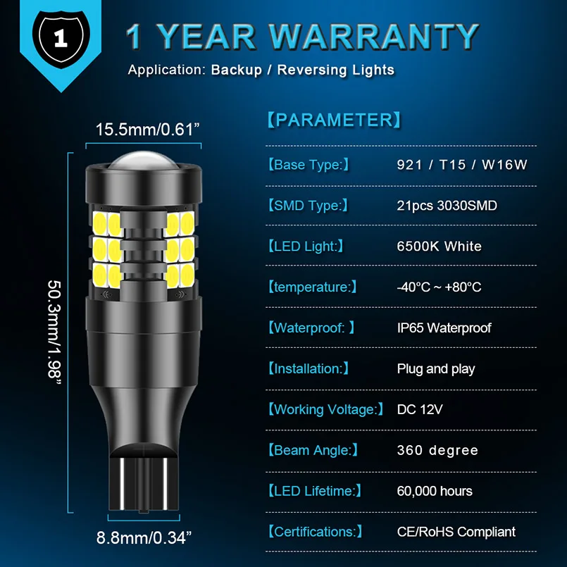 Светодиодный Тип чипа: 21 шт. 3030 SMD Светильник Цвет: 6000K белый Тип розетки: T15 W16W 920 921 912 Напряжение: 12V Номинальная мощность: 3 Вт (Чип на плате) Срок службы: 40000 часов Угол луча: 360 градусов Размер: 42 мм x 15 мм (Д x Ш) Температура:-40 ℃ ~ + 80 ℃