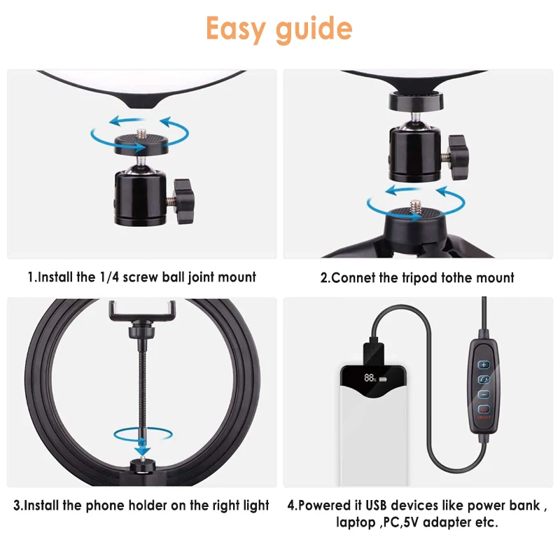 Источник светильник светодиодный SMD Светодиодные лампы: 120 шт. Форма: Кольцо Общая мощность: 5 Вт Длина шнура питания USB 200 см Цветовая температура: 5500 к Диммируемый: Да Диапазон затемнения: 1%-100% Общее освещение: 3600 лм CRI (индекс цветопередачи): больше 83 Адаптер: Универсальный Подставки для фотостудии для видео, портретов и фотосъемки товаров Технические параметры продукта: 3 цвета, плавное затемнение, светильник, теплый светильник, мягкий светильник Цвет: черный Материал: АБС-пластик + металл Размер: Диаметр: 26 см