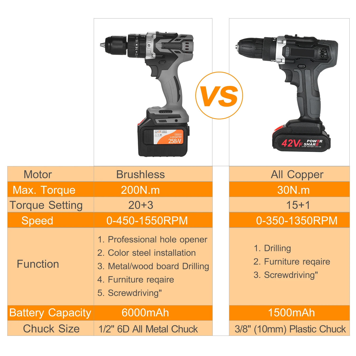 Особенности: Бесщеточный двигатель --- срок службы двигателя до 2x, высокая эффективность для более длительного времени работы и без обслуживания. Беспроводной сверлильный драйвер компактный размер помещается в плотные области, ультра легкий минимизирует усталость пользователя. 2 шт. литий-ионная батарея и быстрое зарядное устройство-2 шт. 7500 мАч большая емкость литий-ионных батарей и 2-часовое быстрое зарядное устройство, которое может использоваться в течение длительного времени после каждой зарядки. Вы можете постоянно работать над своей задачей. 2-Скорость режим точного Управление --- переменной Скорость триггер позволяет точно Скорость Управление. Кроме того, Аккумуляторная дрель имеет 2-Скорость Кнопка настройки, низкая Скорость (0-350 об/мин), отвертка, высокое Скорость (0-1350 оборотов в минуту) для сверления. 15 регулируемое положение сцепления с максимальным крутящим моментом 50N.m, который обеспечивает мощную мощность для сверления деревянной пластиковой доски. Эргономичный дизайн --- эргономичный дизайн в ручке для удобного захвата, переключатель позволяет снимать или заменять винты, как только они будут закреплены. Светодиодный светильник, активированный триггером, повышенная видимость в закрытых рабочих помещениях или в любых темных условиях. Высокая производительность --- характеристики 3/8 дюймов (10 мм) БЕСКЛЮЧЕВОЙ патрон для трещин обеспечивают максимальную прочность и отличную совместимость с аксессуарами, 80 Вт 30N. Мощный крутящий момент m идеально подходит для бурения или завинчивания в деревянной стальной доске/красном кирпиче/цементной стене, удовлетворяя широкий спектр потребностей. Характеристики: Материал: АБС-пластик Вилка: ЕС/США (опционально) Комплект: один набор батарей/два набора батарей (опционально) Модель аккумулятора: 42VF Выходная мощность: 21 в Входная мощность: 100 ~ 240 В Мощность: 80 Вт Частота: 50 ~ 60 Гц Крутящий момент: 0-30N.m Настройка сцепления: 15 + 1 Емкость аккумулятора: 7500 мАч Скорость без нагрузки: 0-350-1350 (об/мин) Аккумулятор: литий-ионный аккумулятор Время зарядки: Appr. 2H Время использования батареи: Appr.200 ~ 300 мин (зависит от метода работы) Бесключевой патрон Размер: 3/8 " (10 мм) Применение: сверление/завинчивание в пластике/дереве/стальной доске/красном кирпиче/цементной стене Дрель Размеры: 18*19,5*5 см/7,1*7,7 * 2.0in Вес сверла: 813 г/28,7 унций Посылка: Один комплект аккумуляторов: 1800 г/63,5 унций Два набора батарей: 2127 г/75,0 унций Посылка Размеры: 30,5*24*8,5 см/12,0*9,4 * 3.3in Посылка: 1 * Беспроводная Дрель 1 * зарядное устройство 2 * Литий-ионный аккумулятор 1 * коробка для хранения 1 * Руководство пользователя