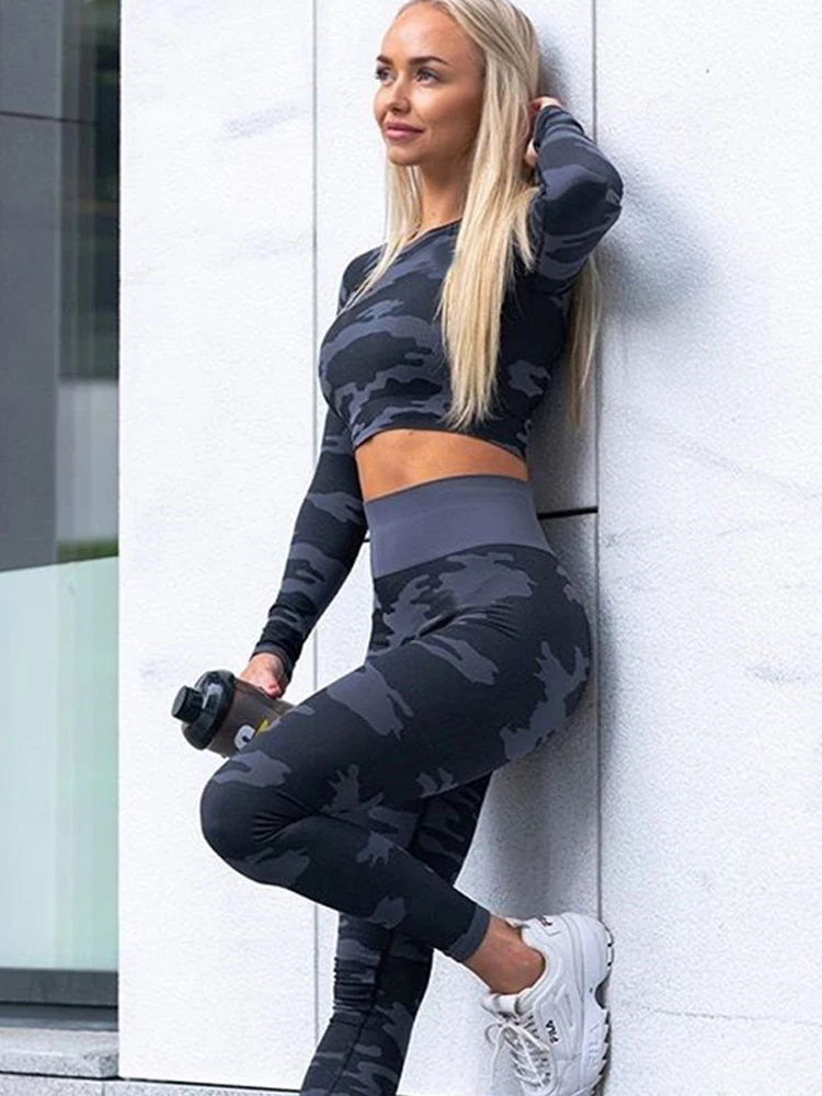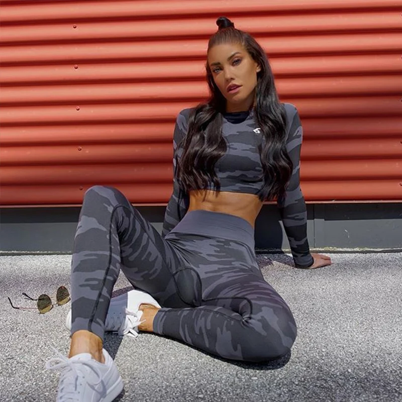 Женский Камуфляжный комплект для йоги с длинными рукавами, топ с круглым вырезом и леггинсы и брюки с высокой талией, обладает высокой эластичностью, подходит для занятий в тренажерном зале, фитнесом, занятий бегом на открытом воздухе, тренировочных костюмов и пуш-ап, быстросохнущих дышащих спортивных костюмов для йоги эффект подъема бедра