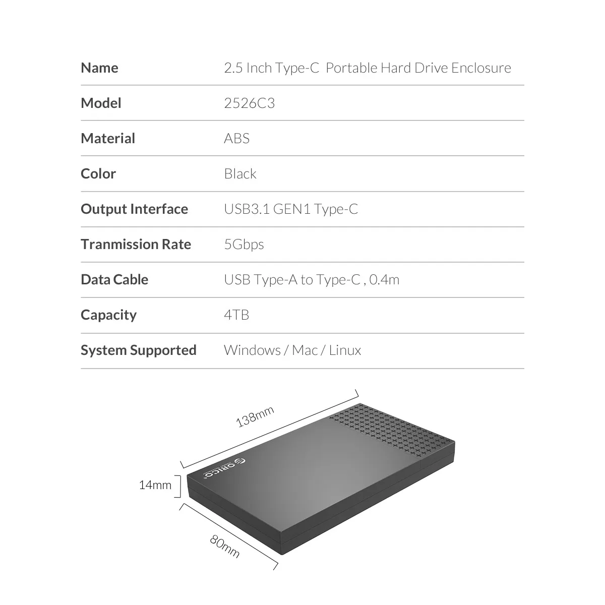 USB3.1 Type-C 2.5 inch SSD/HDD Enclosure