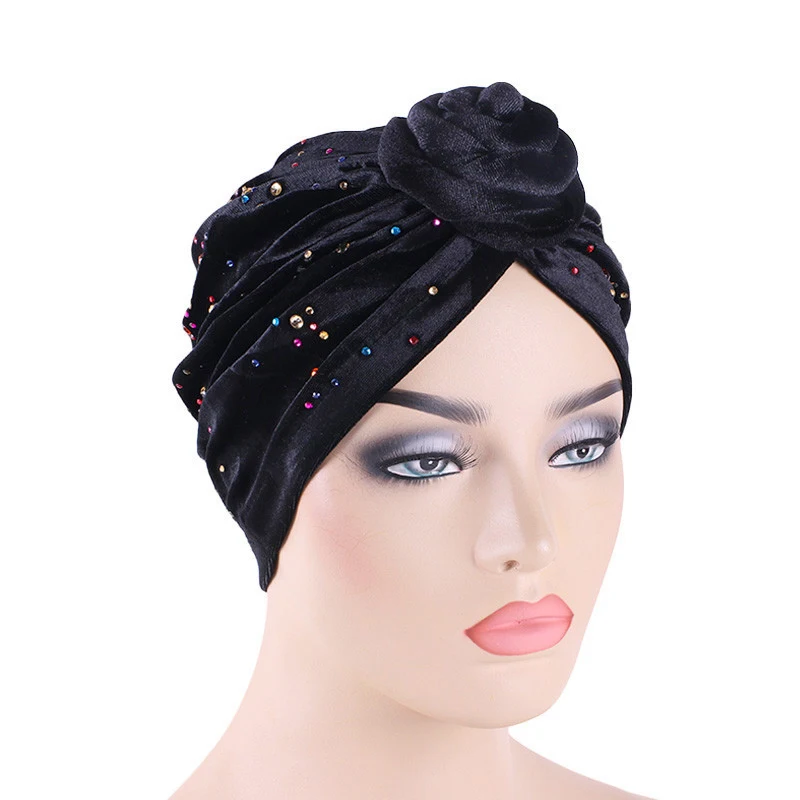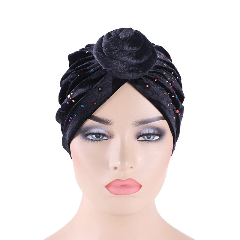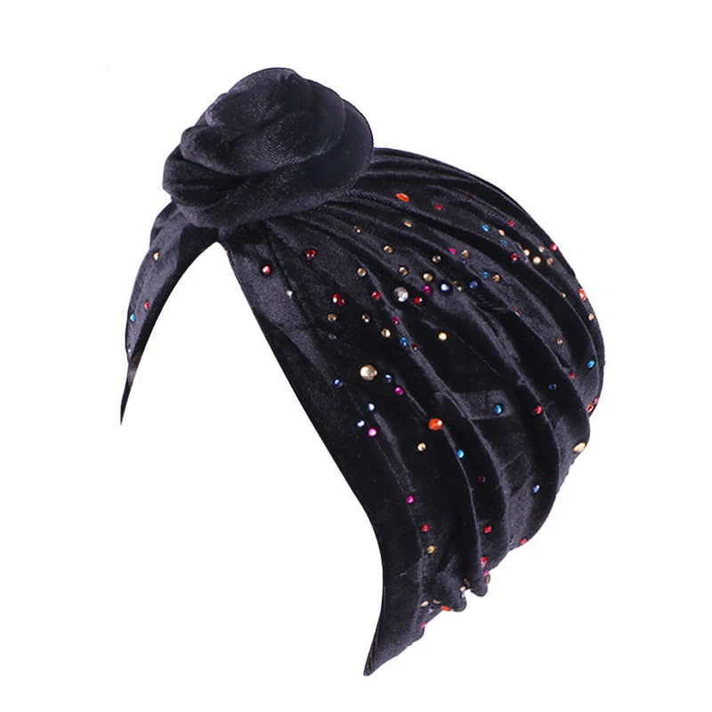 Women Velvet Colorful Rhinestone Muslim Turban Twist Knotted India Hat Chemo Cap