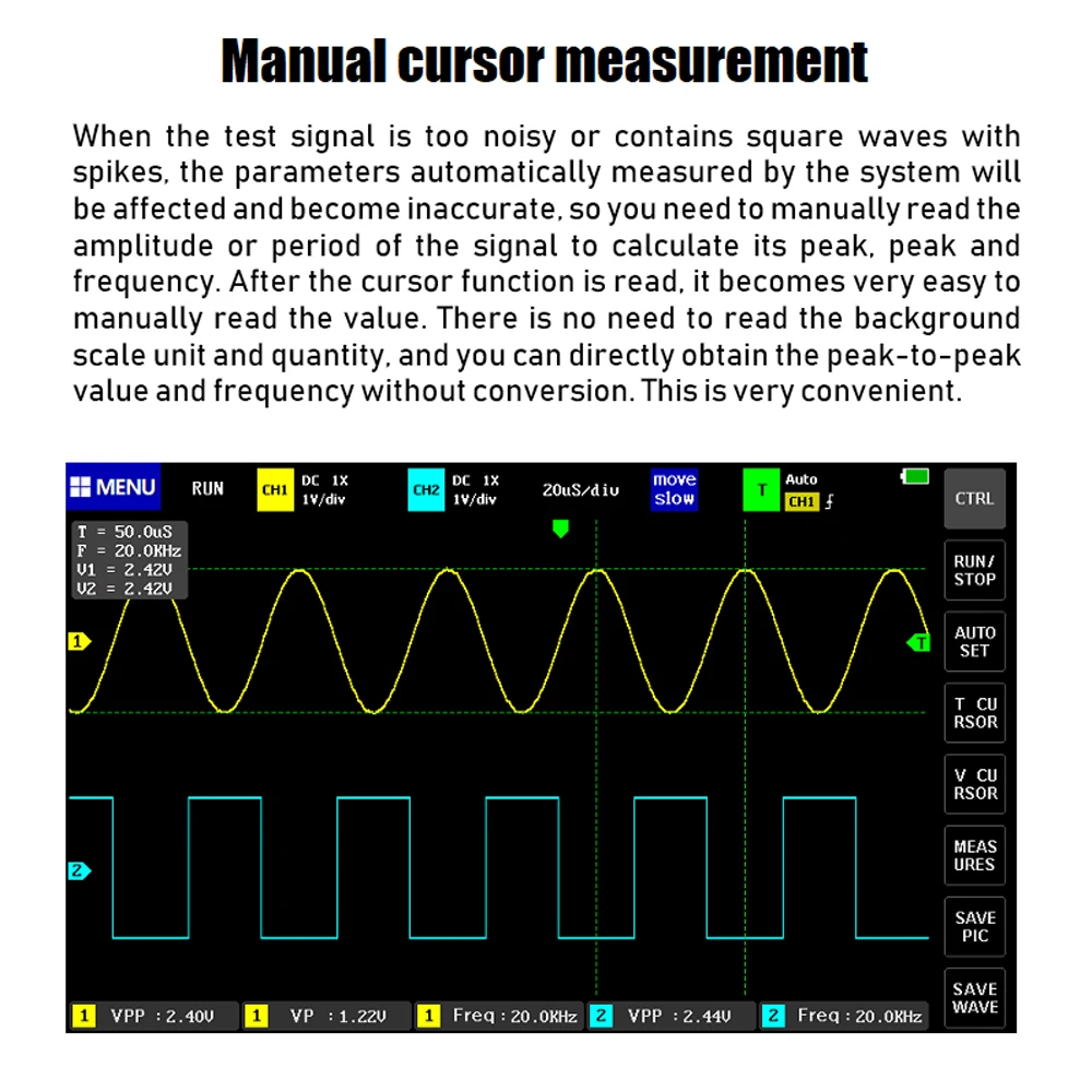 Функция измерения курсора, удобно вручную измерять период, частоту и напряжение.