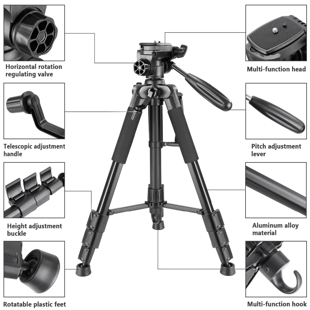 Регулируемый штатив также имеет продуманный дизайн. Клапан с горизонтальным вращением позволяет делать фотографии под любым углом по горизонтали и вертикали; Многофункциональный крючок позволяет повесить дополнительный вес для повышения стабильности; телескопическая регулировочная ручка и рычаг регулировки шаг обеспечивают легкость в эксплуатации и удобную регулировку съемки.