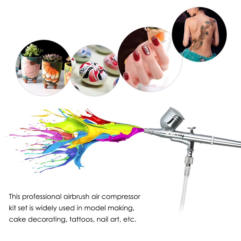 Включает портативный воздушный компрессор, воздушный шланг, двойного действия гравитационный питательный Аэрограф, мини воздушный фильтр и держатель.