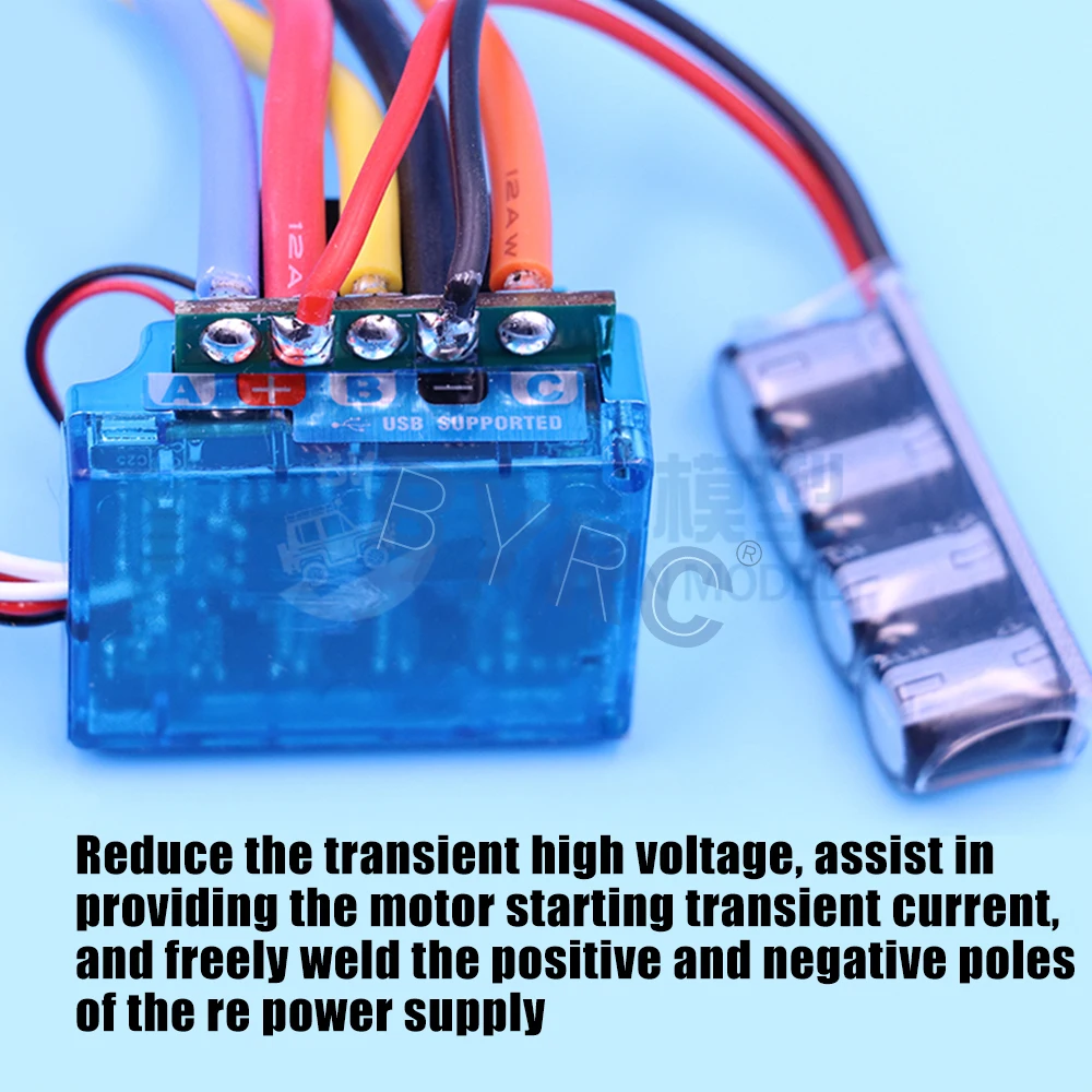 Этот модуль конденсатора (/cappack) предназначен для «модернизации» вашего автомобиля ESC. С помощью этого пакета ускоритель запуска вашего автомобиля будет значительно улучшен. Кроме того, большая выносливость пульсации тока значительно уменьшает генерируемые помехи из-за быстрого включения/выключения силовой трубки ESC.