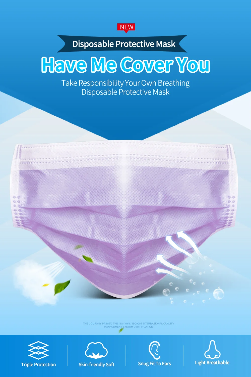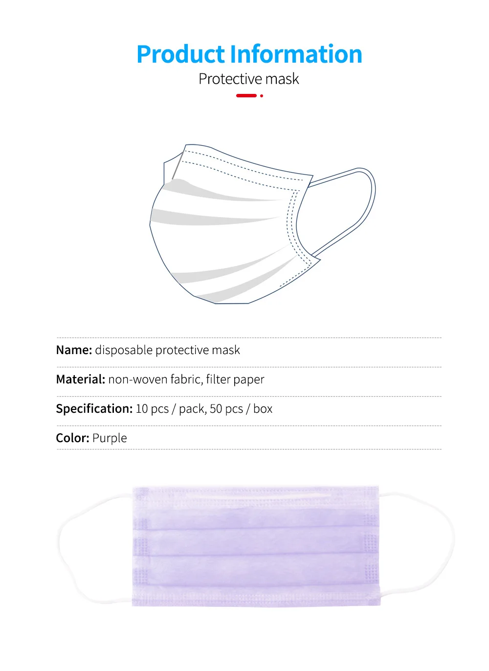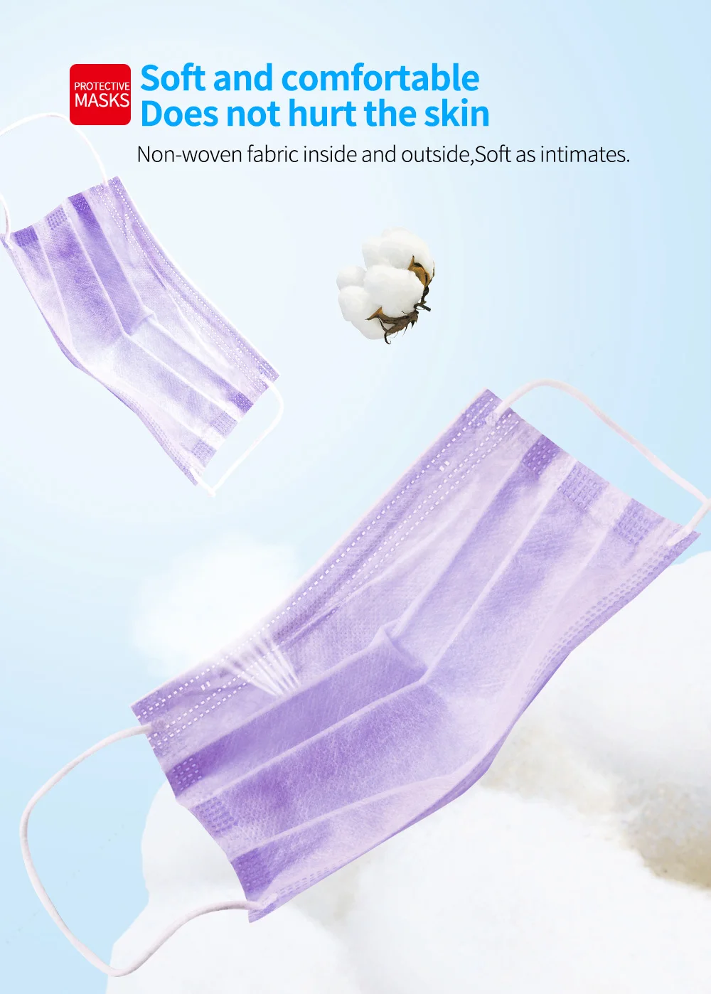 Параметры продукта: Материал: трехслойный нетканый материал Подходящий сезон: Весна, Осень, Зима, Лето Цвет: фиолетовый Стиль маски: Тип уха Размер: один размер Особенности продукта: 1. Новая ткань PP Нетканая ткань, мягкая и чистая, удобная и дышащая 2. Процесс бесшовной вязки 3. Три раза дизайн, больше дышащего пространства на лице 4. Пластиковая полоска для носа, алюминиево-пластиковая полоска для носа, 5. Многослойная защита для вашего дыхательного здоровья Как носить маску: 1. Закройте рот и нос и Повесьте два боковых ремня на уши 2. Фиксация моста носа в соответствии с формой носа предотвращает загрязнения воздуха от входа. 3. Пожалуйста, потяните маску к нижней челюсти, чтобы немедленно предоставить трехмерное дышащее пространство. Пожалуйста, обратите внимание, что указанный Товар производится и распространяется за рубежом и в соответствии с законодательством страны его происхождения