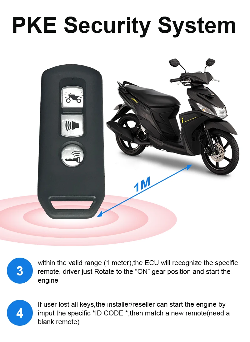 Как использовать ключ? 1. Когда пульт дистанционного управления рядом с мотоциклом, он может открыть замок зажигания, нажать его внутрь, ослабить, светильник диафрагмы, вращать его и начать работу. Если не повернуть его, диафрагма выключится, закройте его автоматически. 2. Поверните шестерни для сиденья, она может открыть сиденье. 3. Поверните положение на шестерне, он может открыть мотоцикл. 4. Поверните положение замка, он может заблокировать ручной тормоз. 5. Когда пульт дистанционного управления не находится в пределах 3 метров от мотоцикла, диафрагма выключится, блокировка автоматически.