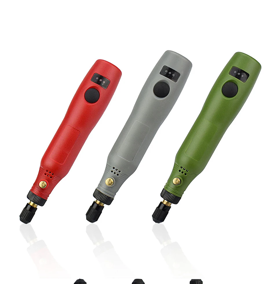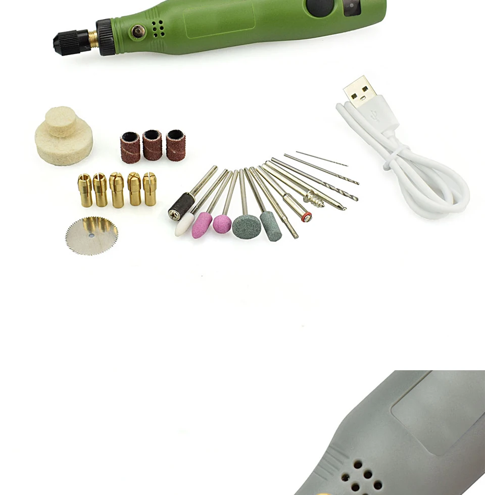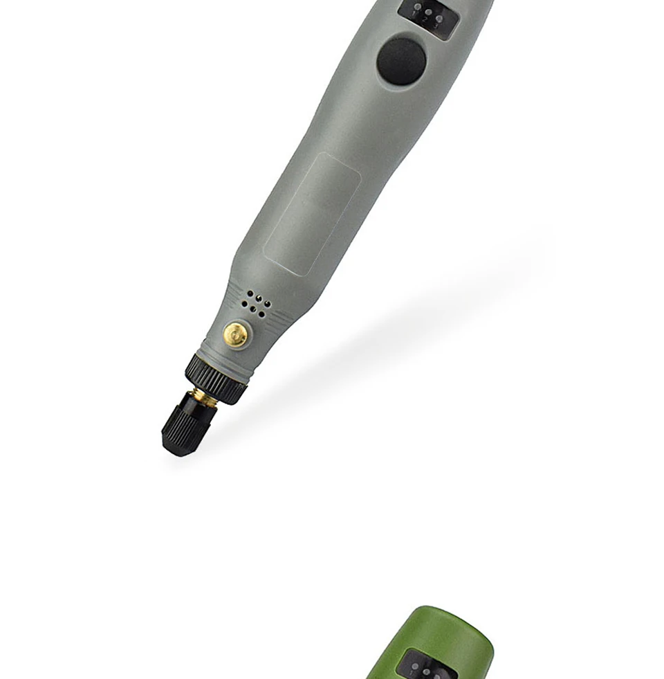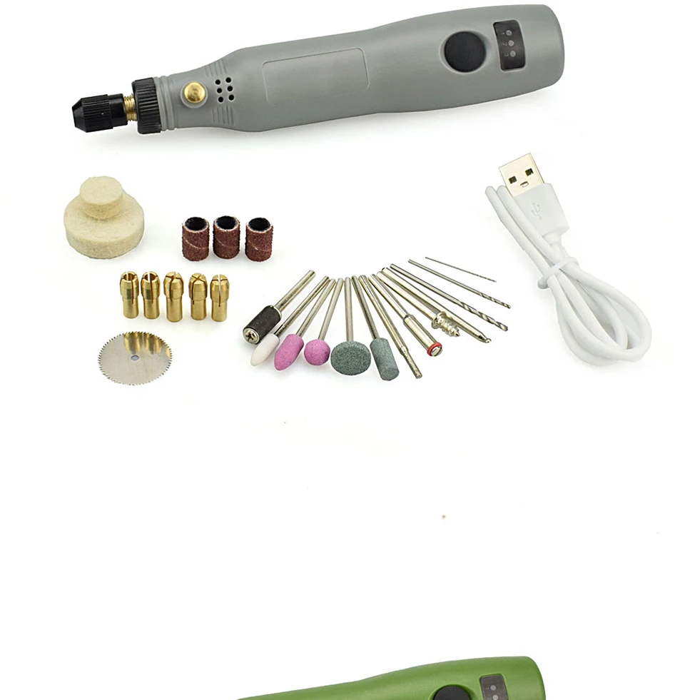 1. Прочный и надежный: маленький размер, светильник вес, легко носить с собой, удобно лежит в руке, нежный контроля при бурении, простых в использовании. 2. Регулировка скорости: Этот Электрический гравировальный инструмент имеет 3 регулировки скорости и диапазон регулировки скорости: 5000-15000 об/мин. 3. Полные аксессуары: оснащены 25 буровыми аксессуарами, все готово. 4. Изысканный шлифовальный станок: Утонченная электрическая шлифовальная машина, подходит для резки, гравировки, фрезерования, шлифования, полировки, удаления и сверления. Набор гравировки шлифовальной машины необходим для самостоятельной гравировки и шлифования. 5. Подходит для Нефритового агата, ядерной резьбы, резьбы по дереву, шлифовки алюминиевой пластины, тонкой медной пластины, пластиковой доски, ДСП, печатной платы, эпоксидной доски и т. д. Характеристики: Материал: АБС-пластик Цвет: серый/зеленый Диаметр патрона: 0,5-3,2 мм Номинальная мощность: 10 Вт Скорость без нагрузки: 15000 5000-об/мин Свободное время: 2 часа Время работы полировки: до 1 часа Выход напряжение: 3,7 V / 10A Входное напряжение: 5 В постоянного тока USB Посылка Вес: около 183 г Посылка включает в себя: 1 x электрическая дрель USB 1 х USB кабель (5 В постоянного тока) 1 x зажим оправки 1 x резиновое колесо 1 х нарезной стержень 1 x дисковая пила 2 x алмазные штифты для заточки 2 шлифовальных колеса из шерсти 3 х круги наждачной бумаги 3 сверла с поворотом 5 шлифовальных колес 6 x электрические сверла патроны (0,5 мм, 1,0 мм, 1,5 мм, 2,4 мм, 3,0 мм, 3,2 мм) 1 х коробка для хранения
