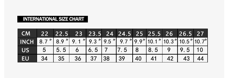 Размеры: Пожалуйста, выберите товар на Размеры в соответствии с длиной Вашей стопы. Если ваша стопа немного широкая и полная стопа, пожалуйста, выбирайте размер больше; Размеры. В случае, если вы не можете убедиться, что Размеры, то, пожалуйста, свяжитесь с нами без промедления. Внимание: 1. Ширина обуви являются нормальными, может быть, вы хотите приобрести обувь не подходит для слишком тонкий или если у вас очень широкая нога. 2. Существует около 0,01 см-0,2 см Средний ошибки с помощью таблицы размеров. 3. Товар, просим сначала измерить длину стопы, как показано на рисунке:
