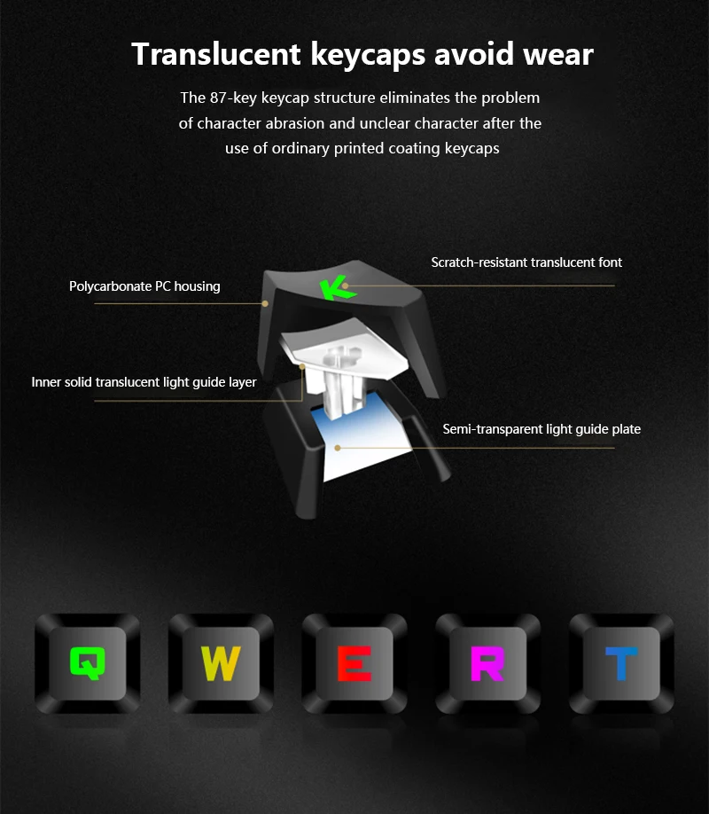 Структура 87-key keycap, принцип светоизлучающий светильник полностью отличается от того, что Лазерная Гравировка Печати keycap, что устраняет проблему износа персонажа и неясного персонажа после использования колпачков с печатным покрытием