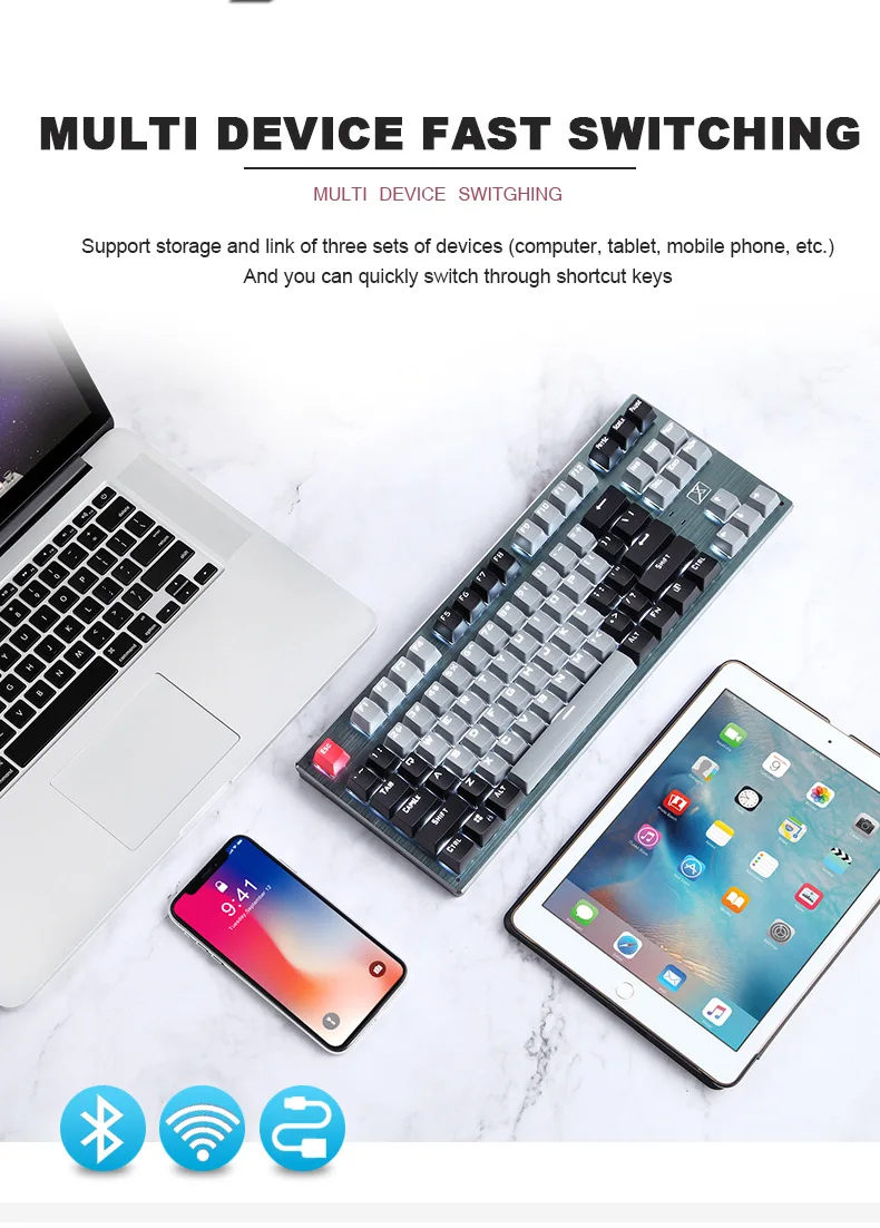 Тип: игровая клавиатура Количество клавиш: 87 (ключи) Интерфейс: USB Подключи и работай: Поддержка Способ подключения: Bluetooth/2,4 ГГц беспроводной/Тип C зарядный кабель Мультимедийные функциональные клавиши: Да Клавиш: Да С или без ручного отдыха: нет Функция водонепроницаемости: Поддержка водонепроницаемости Ключевые технологии: Механическая ось Функция подсветки: поддержка подсветки Эргономичность: Поддержка Материал: АБС-пластик Длина кабеля: 1,5 (м) Вес изделия: 0,86 (кг)