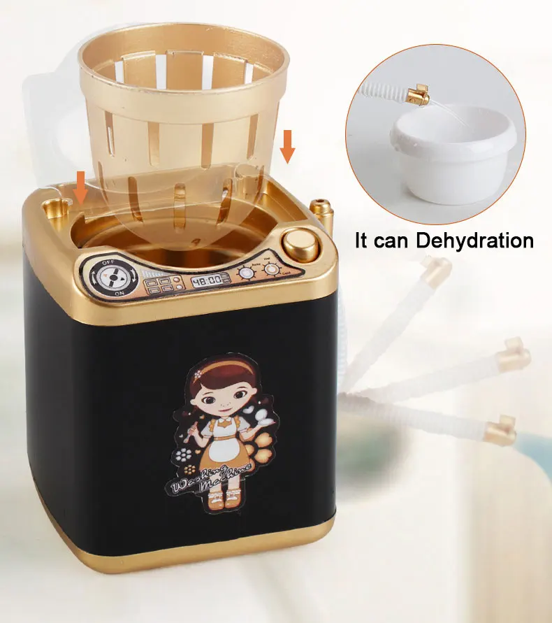 1.The washing machine can pour water in, turn on the switch, and the washing machine starts spinning, just like a real washing machine. Please pay attention to water not too much, too much water will overflow, please control the amount of water