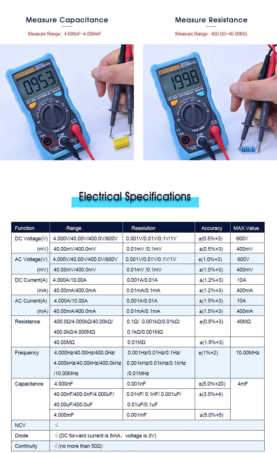 Resistance: 400.0Ω/4.000kΩ/40.00kΩ/400.0kΩ/4.000MΩ ±(0.5%+3); 40.00MΩ ±(1.5%+3);