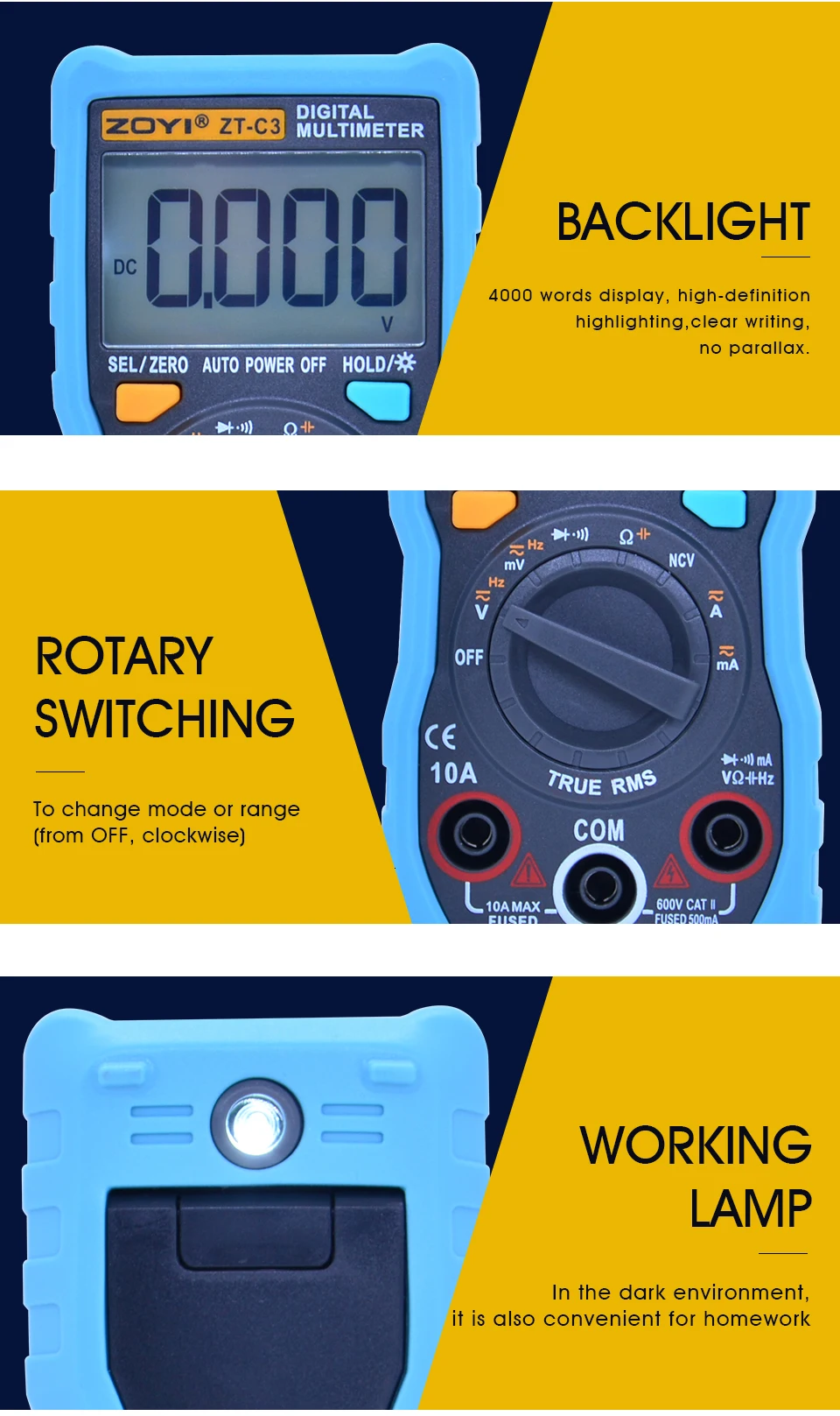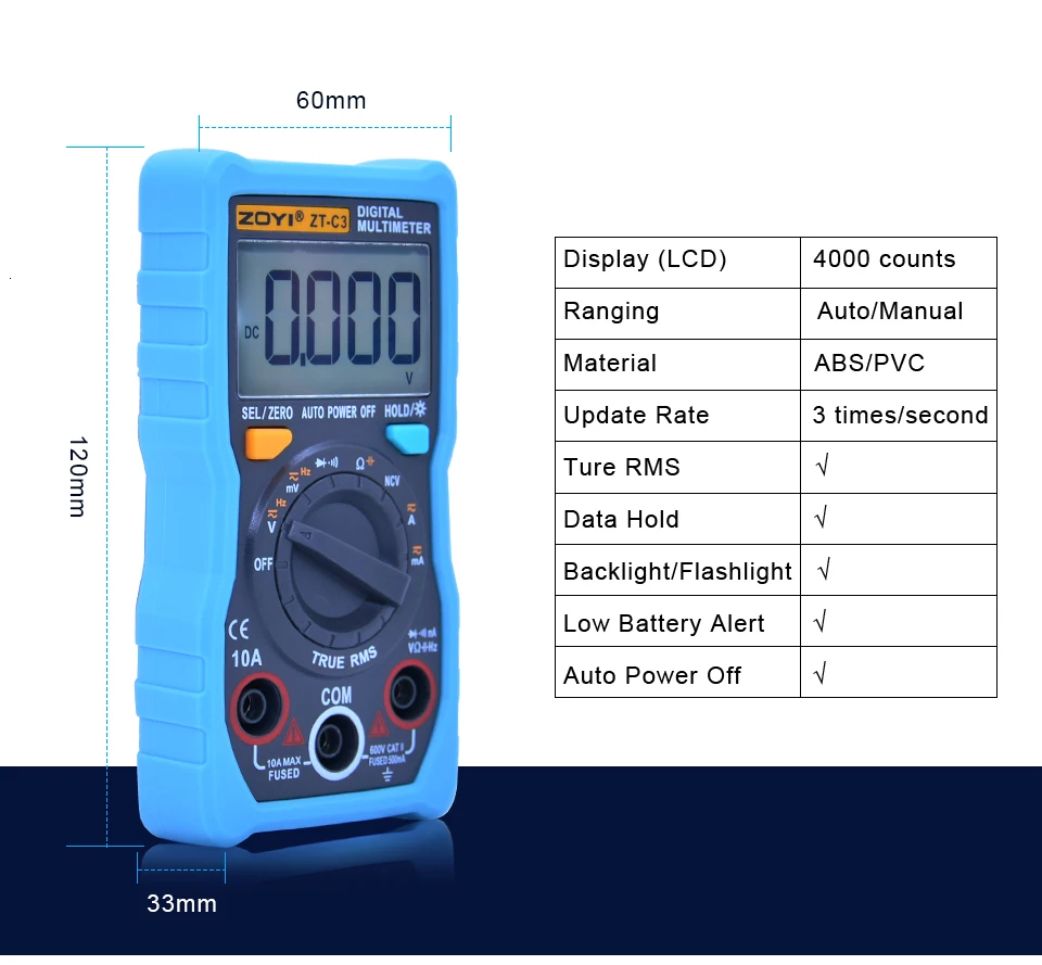 This product is a battery-powered, true-rms, auto-ranging digital multimeter with a 4000 counts, LCD displayand backlight/flashlight.