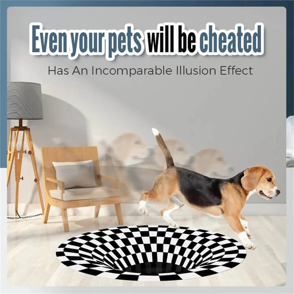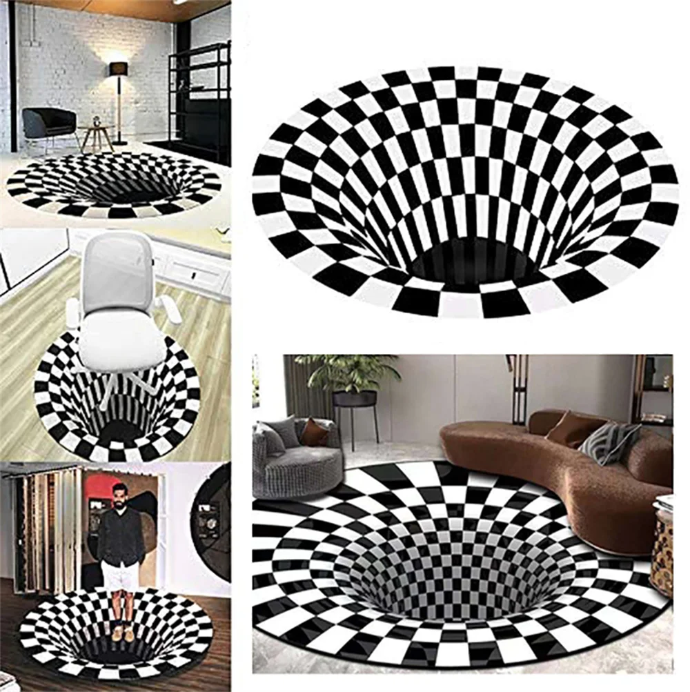 * This 3D vortex carpet has an incomparable illusion effect! Premium 3D House Mat.* Individually hand-embroidered. Best illusion effect. Good conversation starter!* Durable and water resistant: The carpet is made of polyester, odorless, soft to the touches, anti-slip, this thick and soft carpet can reduce foot fatigue.* It has a beautiful appearance that perfectly matches any style of home décor and adds elegance and warmth to any area.* Easy To Wash: Our soft carpet has an extra anti-slip layer on the back that help hold in place on wooden or other materials floor, And hold up even with kids and pets. This carpet is a great decor for the kids bedroom, Nursery, Classroom and dorm.Note:* Actual color may be slightly different from the image due to different monitor and light effect. * Please allow 1-3cm deviation due to manual measurement.Package Include:* 1 x Area Rugs