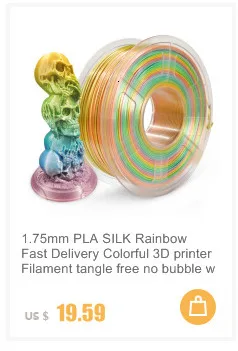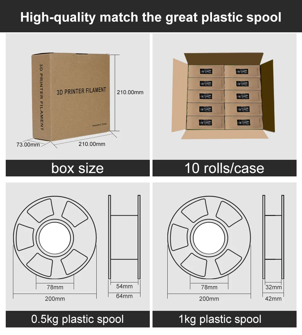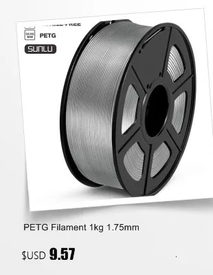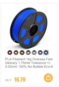 Диаметр провода: 1,75 мм Допуск: ± 0,02 мм Температура печати: 200-230 ℃ Температура нижней пластины: клей требуется, когда не нагревается. Клей не требуется для нагрева 60-80 ℃ Напряжение (кгс): 11-16 Индекс расплава: 7-9 г/10 мин (190 ℃, 2,16 кг) Удлинение при разрыве: 4% Скорость печати: 50-100 мм/сек. Пузыри: 100% нулевые пузыри Вес нетто: 1 кг/рулон Вес брутто: 1,3 кг/рулон Длина: 1,75 мм (1 кг) = 330 м
