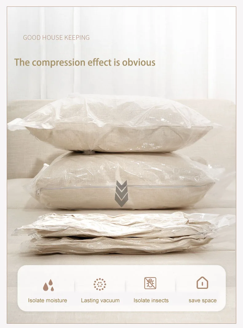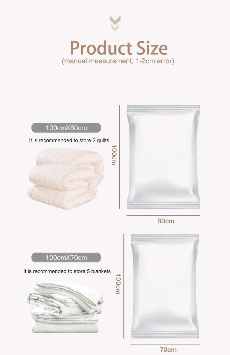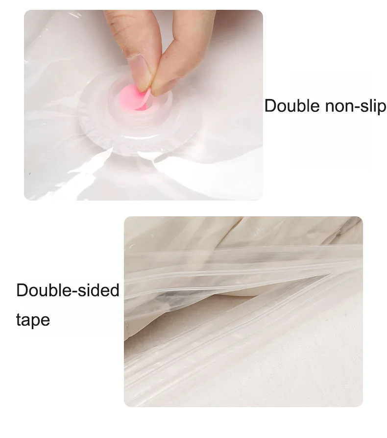 Характеристика: · PE + PA материал, прочный и не легко сломать, может быть повторно использован · Здоровый материал, нетоксичный и безвкусный, без формальдегида и бензола · Прочная, Взрывозащищенная · Сильное уплотнение, эффективно изолирует влагу и пыль, изолирует насекомых · Эффект сжатия очевиден, подходит для всех видов одежды и одеял, экономит место Как использовать: 1. Положите одеяло или одежду в сумку для хранения 2. Скользящий писк назад и вперед несколько раз 3. Откройте уплотнительную крышку для всасывания 4. Затяните крышку