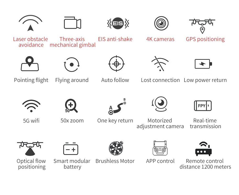 Функция: складная, один ключ запуска, один ключ посадки, высота удержания, оптическая постоянная поток, двойная камера, Wi-Fi подключение, управление приложением, фото жестов, запись жестов, Inteigent IPP далее, следуя за мной режим, palmконтроль (снизу слева направо), выездная точка, интересующие точки, контроль скорости, Передача в режиме реального времени, обмен картинками и видео, GPS домашний возврат.