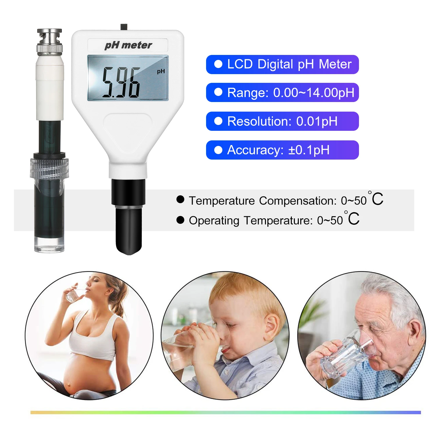 Надежное качество: Высокая чувствительность водонепроницаемый зонд смарт-чип для быстро и точно измерения и 1,5-дюймовый ЖК-дисплей экран с белой подсветкой, чтобы отобразить значение рН четко.