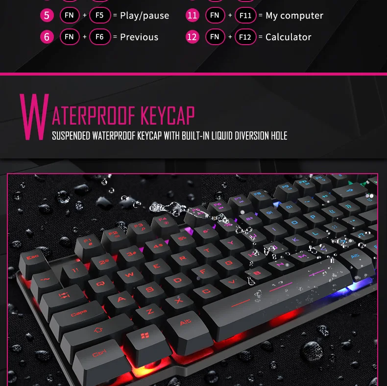Тип: игровая клавиатура Количество клавиш: 104 (ключи) Интерфейс: USB Поддержка plug and play: Поддержка Подключение к компьютеру: Проводное Есть ли мультимедийная функциональная клавиша: Да Клавиша быстрого доступа: Да С или без ручного отдыха: нет Функция водонепроницаемости: Поддержка водонепроницаемости Ключевые технологии: кратерная архитектура Поддержка эргономики: Поддержка Материал: АБС-пластик Длина кабеля: 1,4 (метров) Размер изделия: 49X16X4 Вес изделия: 0,7 (кг)
