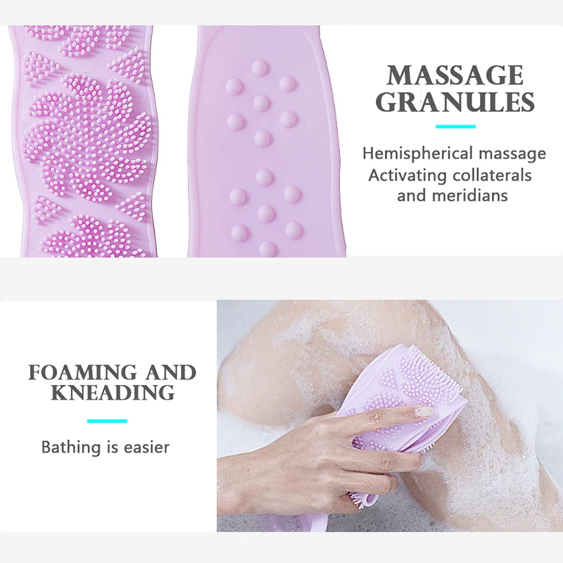 Clean and scrub with this silicone towel now and keep it clean!Those hard-to-reach places can sometimes be painful, and now we have the solutionGood cleaning effect. Cleans pores, removes dirt, excess sebum and dead skin, making your skin smootherThe double-sided lines with bump design can effectively bring you a cleaning effect. Silicone wipes are dry, greatly reducing bact survivalDouble-sided back scrubber and massager foot / single cleaner shower-cleans, massages and exfoliates the body, cleans your feet without bending, and you can enjoy a soft and comfortable bodyProduct:Long silicone bath brushMaterial:siliconeProduct Size: