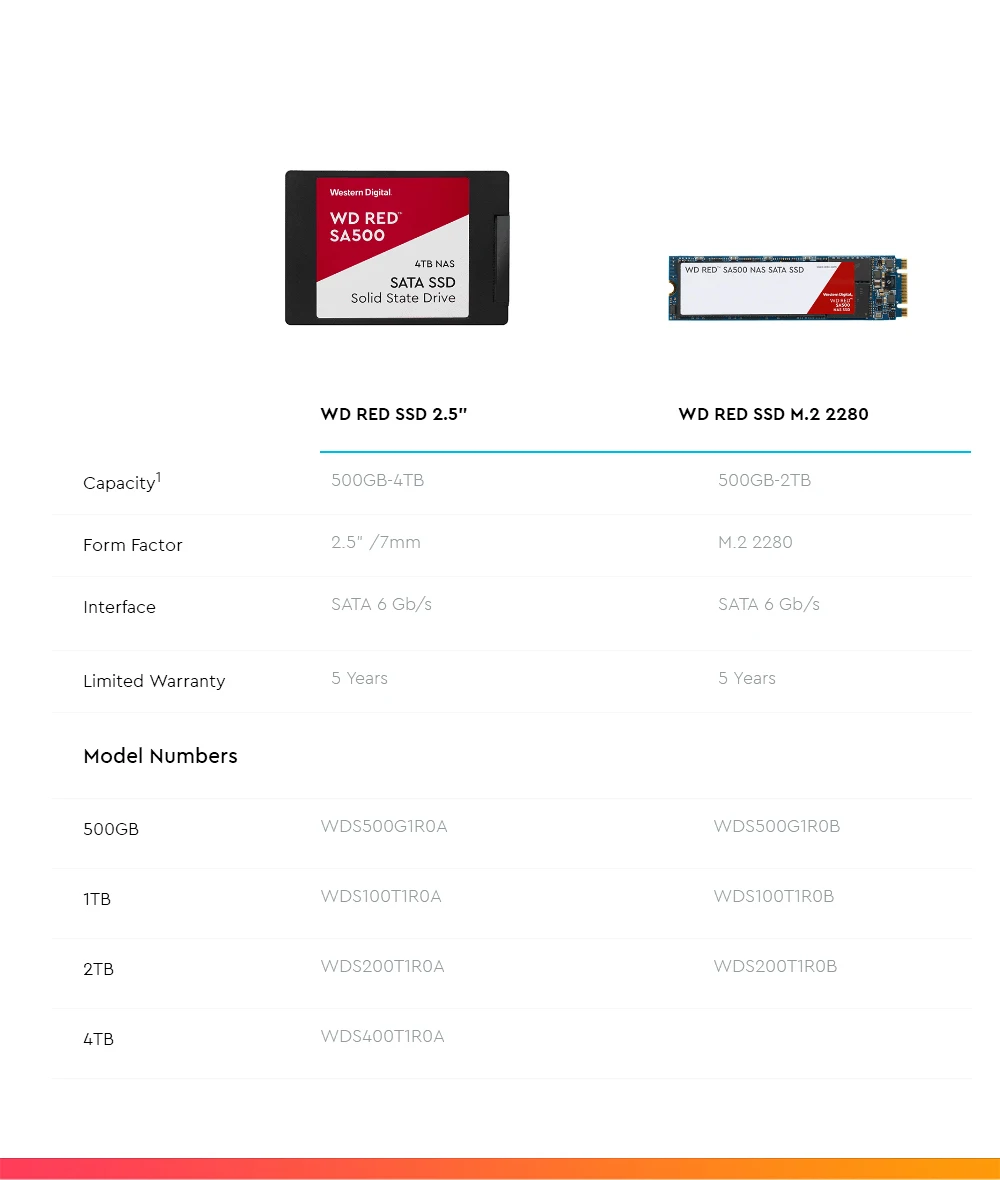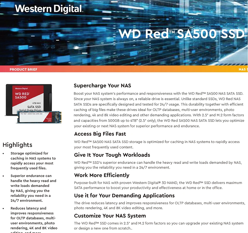 Модель WD Red™SSD поставляется в 2,5 "и M.2 форм-факторы, так что вы можете обновить ваш существующий NAS системы или дизайн новую от царапин.