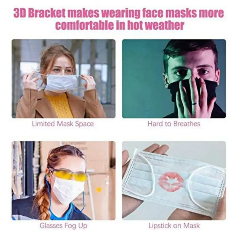 Легко дышит-он удерживает маску вокруг рта, чтобы создать более дышащее пространство, когда маска надета на лицо. Очиститель для ношения-кронштейн уменьшает частоту трения между маской и лицом, чтобы защитить подкладку от окрашивания. Защита губной помады-это делает маску не приклеивать помаду, защищая ваш идеальный макияж от запутывания. Моющийся и многоразовый-пищевой силиконовый материал безопасен, моющийся и многоразовый. Рекомендуется использовать двустороннюю ленту или нить, чтобы закрепить силиконовую рамку на маске, чтобы она работала лучше.