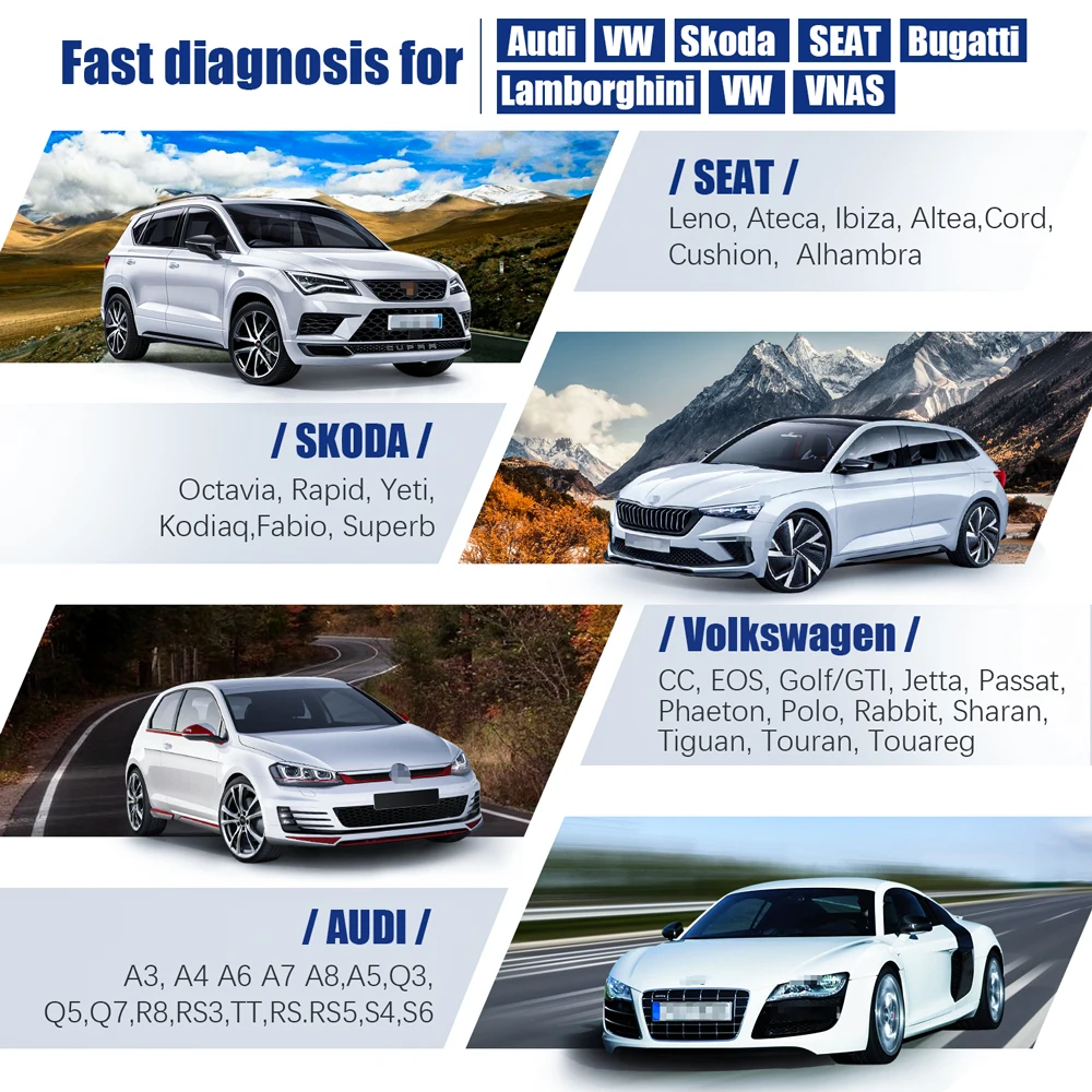 1. Профессиональный сканер для AUDI, для VW, для Skoda, для сидений автомобилей. 2. Пожизненное бесплатное обновление онлайн. 3. Поддержка нескольких языков: Английский, французский, испанский, немецкий, русский, шведский, португальский, финский, норвежский, датский. 4. Поддержка нескольких функций: Этот сканер OBD2 не только поддерживает основные функции, но и поддерживает некоторые специальные функции: ABS кровотечение, сброс подушки безопасности, SAS reset, EPB Reset,TPMS Reset,Oil Service DPF Reset и т. д.