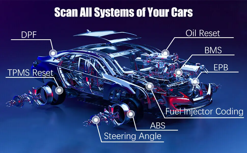Сброс давления в шинах (TPMS) TPMS сервис: просматривает идентификаторы датчиков шин от ECU транспортного средства и выполняет программирование и сброс TPMS после того, как датчики давления в шинах заменены. Выполнять диагностику ABS и SRS Этот диагностический инструмент позволяет считывать коды, четкие коды и считывать прямые данные в дополнительной удерживающей системе (подушка безопасности) чтобы убедиться, что он работает нормально и противоскользящая тормозная система, чтобы избежать блокировки колес или неконтролируемого скольжения, а также выключить предупреждающий светильник Дроссельной заслонки для обучения Адаптация дроссельной заслонки: Инициализация приводов дроссельной заслонки в состояние по умолчанию для точного регулирования работы дроссельной заслонки (или двигателя холостого хода). Сброса масла Сброс обслуживания масла: он может выполнять Сброс для системы эксплуатации моторного масла, которая вычисляет оптимальный интервал изменения срока службы масла в зависимости от условий вождения автомобиля и климата, и выключить предупреждающий светильник. EPB замены тормозных колодок Обслуживание EPB: сброс тормозных колодок после ремонта в электронной системе стояночного тормоза. С помощью этой системы процесс торможения становится намного проще и проще. Угол поворота руля обучения SAS измеряет угол вращения, скорость угла и направление руля, предоставляя информацию о направлении, в котором водитель хочет идти. Датчики угла рулевого управления необходимы для таких систем, как ESC, а также используются в системах рулевого управления и активного рулевого управления (EPS или AFS), а также в системах помощи при парковке и системах кривого освещения. Регенерация дизельного сажевого фильтра (DPF) DPF-это устройство, предназначенное для удаления дизельных твердых частиц или сажи из выхлопных газов дизельных двигателей транспортных средств. Батарея регистрации Цель BMS-Обещать безопасную и надежную работу батареи путем мониторинга и оценки состояния батареи, включая состояние заряда, состояние здоровья и состояние жизни, управление зарядкой и разрядкой аккумулятора, балансировка ячейки и т. д. Как электрохимический продукт, Аккумулятор действует по-разному в различных условиях эксплуатации и окружающей среды.