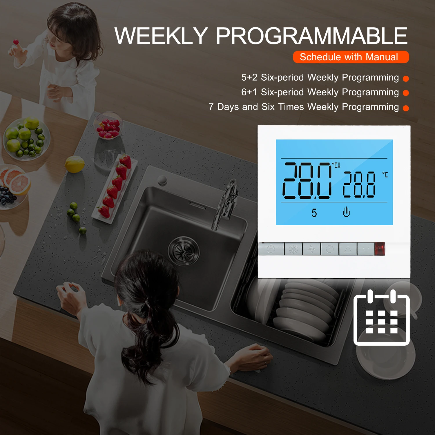 Еженедельный программируемый-поддерживает 5 + 2/6 + 1/7 дней различных температурных режимов в соответствии с 6 режимами ежедневной работы, высокоэффективный и энергосберегающий термостат, чтобы помочь снизить затраты на домашнюю энергию.