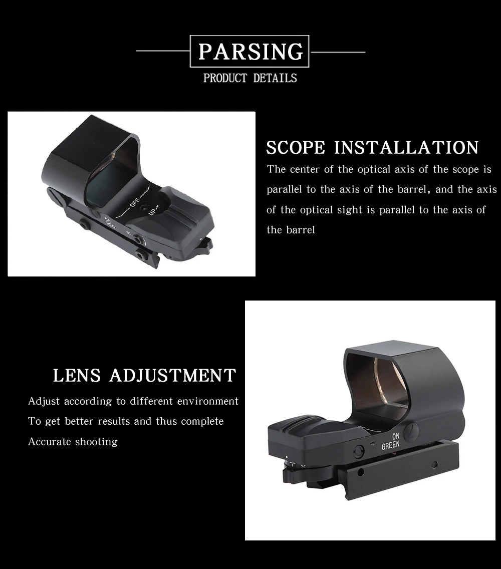 Увеличение: 1x Диаметр объектива: 22 мм FOV: 15,8 m @ 100m Железные дороги: 22 мм Дифференциация режим: 4 Дифференциация Цвета шелка: красный, зеленый Киоски: на пуговицах Зеркальная поверхность корпуса: черный Продукт Размеры: 90x55x66mm Упаковка 1 * Абсолютно Новый HD119 1 * литиевая батарея CR2032(Иногда не включая) 1 * Инструкция по эксплуатации 2 * шестигранный ключ, дюймовый стандарт 1 * салфетка для очистки линз (Иногда товары не содержат батареи из-за ограничений авиационной безопасности)