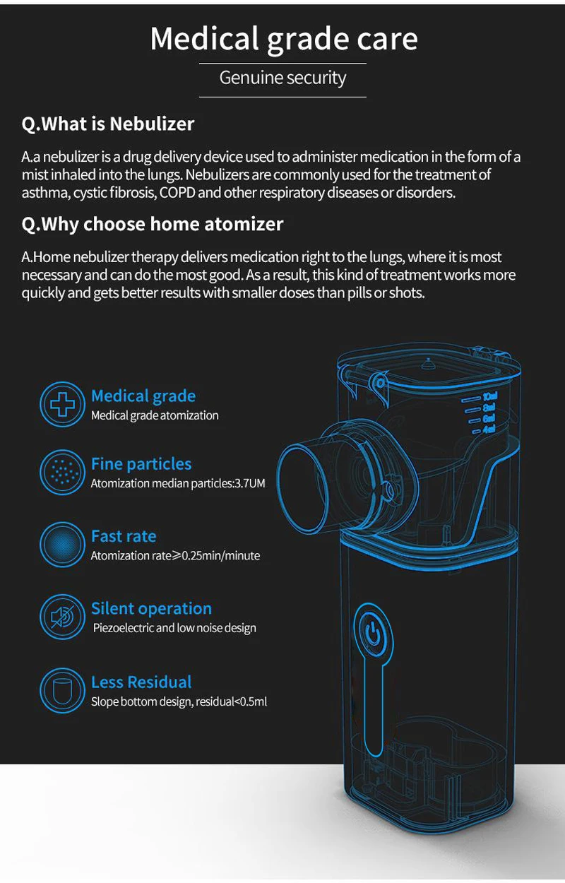 Медицинский небулайзер изготовлен из медицинских материалов, с более мелкими небулизованными частицами, и прошел медицинский сертификат. Безопасность гарантирована Распылитель использует обычные материалы, которые могут использоваться только для увлажнения и не могут достичь медицинских эффектов