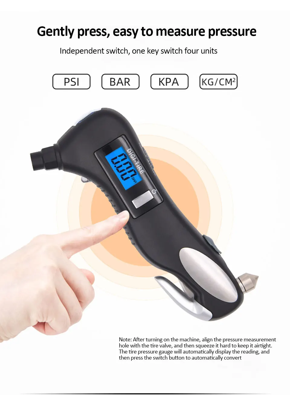 Название: цифровой манометр для шин 5 в 1 Материал: АБС + нержавеющая сталь Цвет: как показано Размер: 6,5*3,0*16,2 см Батарея: 2 * AAA батареи(Не входит в комплект) Диапазон измерения: 0 ~ 150Psi; 0 ~ 10,3 BAar; 0 ~ 1034kpa; 0 ~ 10,5 kg/c㎡ Дополнительные функции: светодиодный светильник/светильник вспышки/молоток безопасности/резак ремня безопасности