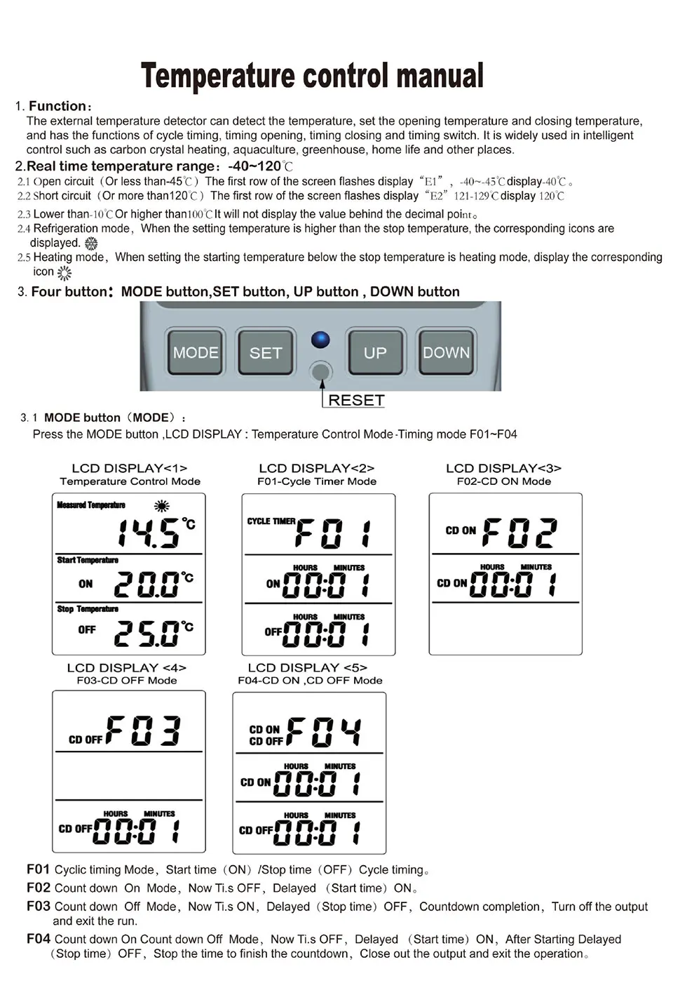 Внешний температурный детектор может обнаруживать температуру Установите температуру начала и остановки Время цикла, время запуска и остановки, таймер Он широко используется в интеллектуальном управлении, таких как углеродное отопление, аквакультура, теплица, домашняя жизнь и другие места. 2. Технические параметры Напряжение 100-250 В переменного тока 50 Гц Максимальная нагрузка: 16A(2) 3680 Вт (15A для американского типа) Диапазон температур: -40 ~ 120 °C Точность: +/- 1% Точность синхронизации: максимум 10 минут Диапазон температур: -40 ~ 120 °C Открытая схема (или менее-40 °C), первый ряд экрана мигает дисплей "e1'', -40 ~-45 °C, дисплей-40 °C Короткое замыкание (или более 120 °C ), первый ряд экрана мигает displaty ''E2'', 121-129 °C дисплей 120 °C Ниже-10 °C или выше 100 °C, это не будет отображать значение после запятой Режим охлаждения, температура запуска> Температура остановки Режим нагрева, запуск температуры <температура остановки 3. Кнопка режима Нажмите режим. ЖК-дисплей: режим контроля температуры Режим синхронизации F01-F04Купил у этого магазина пилу.Покупал WOYOFADA,а пришло какое то фуфло.12" шина а пилит только бруски 50*50,и если не применять усилие.Если... Читать отзыв полностью...