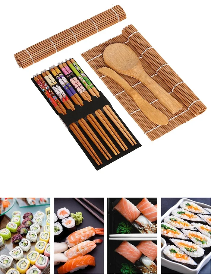 * Полный суши-комплект-поставляется с 2 ковриками для суши, 5 пар палочек для еды, 1 разбрасыватель риса и 1 весло для риса, что удобно для дома, офиса, вечерние и так далее.