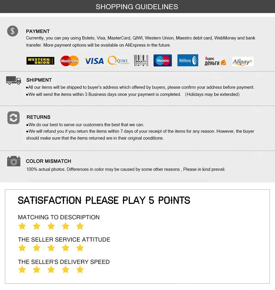 Пожалуйста, перед покупкой 1. Дорогой друг, при нормальных обстоятельствах, мы отправим посылка в день покупки и оплаты. Если это Праздничная оплата, отправьте посылка в течение 3-7 дней (рабочий день). 2. Как правило, мы отправим вам этот товар через зарегистрированную авиапочту Почта Китая и AliExpress Logistics-S1 без беспокойства. Дорогой друг, после того, как ваша оплата прошла успешно, средства проходят контроль риска. Мы можем отправить вашу посылка в тот же день. В особых случаях (например, в праздничные дни) Мы отправим посылка в течение 3-7 дней (рабочих дней). 2. Как правило, мы отправляем вам товар через Почта Китая заказной авиапочтой и AliExpress без беспокойства. Если вам нужна быстрая доставка, вы можете выбрать коммерческую Экспресс-доставку, но они взимают плату. Информация об отслеживании будет обновлена в течение 3 дней, и вы можете отследить ее на www 17track. Россия занимает от 15 до 60 дней (обычно посылки могут быть получены в течение 15-25 дней). Украина/Беларусь/Казахстан/Израиль занимает от 25 до 60 дней (обычно посылки могут быть получены в течение 25-35 дней) обычно занимает 2-3 недели, чтобы добраться до США, Европы, И Канаду, и от 30 до 90 дней для стран Южной Америки. Это время, которое мы предоставляем на основе опыта. Пожалуйста, обратитесь к поставщику логистики при получении посылка в конце, я надеюсь, друзья могут понять. 3. Скорость таможенного оформления влияет на время доставки. Пожалуйста, проверьте информацию об отслеживании. При необходимости, свяжитесь с вашей таможенной службой и помогите им очистить таможню. Это позволяет быстрее получить ваши товары. 4. После получения заказанного товара, пожалуйста, внимательно проверьте его в течение 24 часов. Если вы еще не получили время доставки или другие вопросы, пожалуйста, свяжитесь с нами. 1. Фотографии, которые мы показываем, являются 100% реальной фотографией. 2. Из-за влияния материалов одежды, дисплеев и других факторов могут быть вызваны незначительные различия в изображениях и предметах. Окончательный цвет, пожалуйста, обратитесь к фактическому товару в нашем магазине. 3. В зависимости от размера, размер может отличаться на 2-3 см. О отзывы 1. Положительные отзывы (5 звезд) очень важны для нас, пожалуйста, оставьте свои долгосрочные положительные отзывы и 5 звезд Узнайте больше о вашем заказе. После показа нам двух пятизвездочных скриншотов, мы предложим скидку в $1- $5 для вашего следующего заказа. 2. Если вы не удовлетворены нашей продукцией, пожалуйста, свяжитесь с нами, прежде чем оставить отрицательный отзывы, мы гарантируем Мы приложим все усилия для решения этих вопросов. 3. Если вы поделитесь ссылкой на наш продукт на SNS или Facebook, мы также предоставим 10% скидку или подарок для вашего заказа. Отзывы: (в том случае, если вам нравится этот товар, пожалуйста, поставьте нам оценку 5 старт отзывы. Если у вас есть какие-либо вопросы, пожалуйста, свяжитесь с нами. Я желаю вам счастья 5. Приветствуются индивидуальные продукты, приветствуются клиенты, которые размещают заказы напрямую, в розницу или оптом. Если у вас есть какие-либо вопросы, независимо от размера, цены или материала, пожалуйста, свяжитесь с нами, мы 6. Прибыль каждого из наших продуктов очень низкая, мы просто надеемся, что вам понравится и оставим пятизвездочные отзывы, чтобы поддержать их, спасибо. 7. Если вам нужна оптовая продажа, вы мож