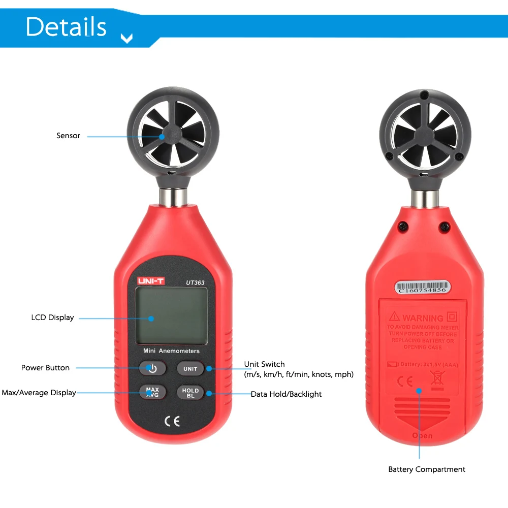 Этот Анемометр является портативным и полезным, который может измерять скорость и температуру ветра, он также может показать вам масштаб ветра и указать ветряной холод. ЖК-дисплей с подсветкой, его легко читать в ночное время.