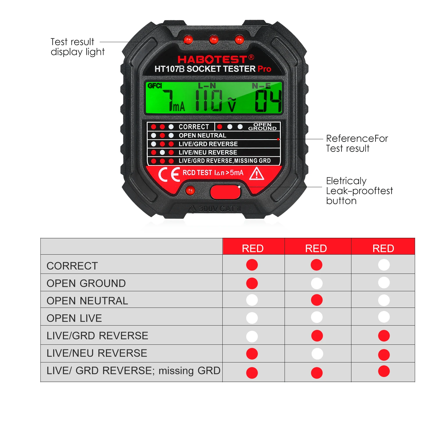 6 моделей светодиодный светильник --- с 6 легко читаемыми индикаторами, чтобы указать состояние розетки, легко определить: правильный, открытый, открытый, нейтральный, живой/нейтральный, live/Ground Reverse, Live/Ground Reverse, отсутствует земля.
