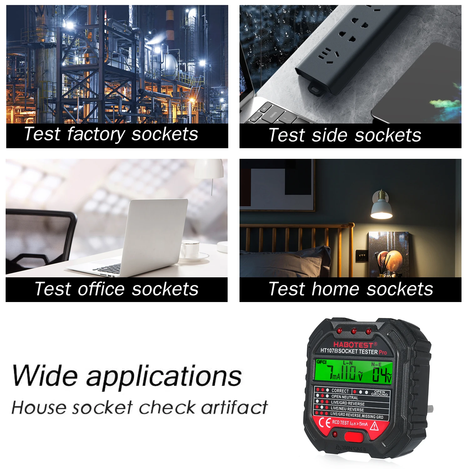 Широкое применение-широко используется для тестирования электрического обслуживания, тестирования офисных розеток, тестирования силовых полосок и тестирования настенных розеток в школе, лаборатории, фабрике и других социальных областях. Приемка и проверка безопасности дома, это экономит вам много времени при тестировании проблем с розетками.