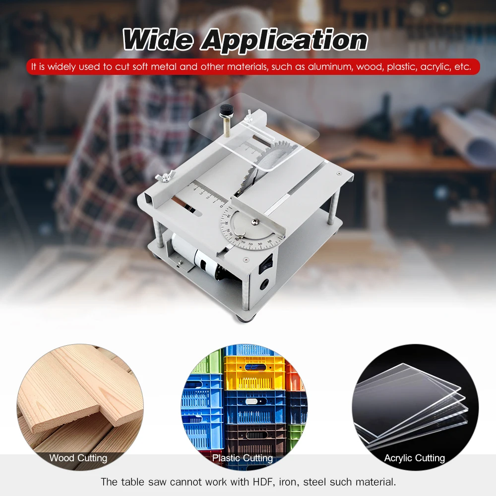 Эта Бытовая пила для стола прочная, портативная, практичная и простая в использовании. Также оснащен двигателем высокой мощности, он может достигать высокой скорости резания 3000 об/мин для резки дерева, пластиковой доски, акриловой доски и многого другого с эффективностью. Сделать работу по резке проще.