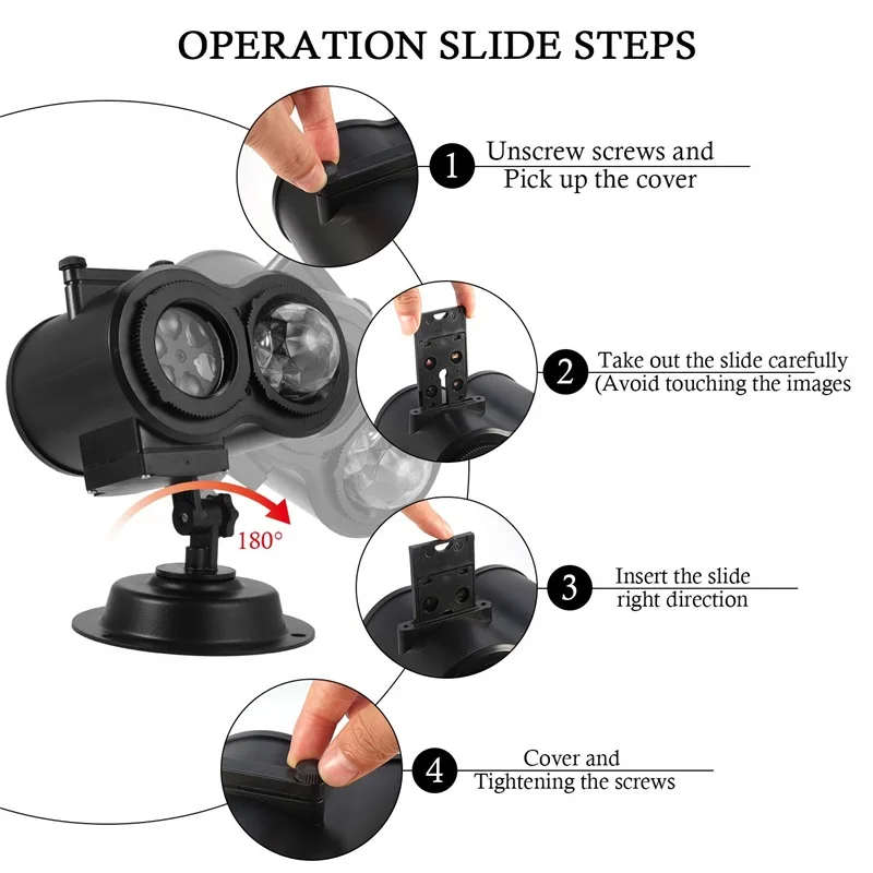1. Пожалуйста, не помещайте проектор под воду или не замачивайте в дождь. 2. При установке или разборке пленки, пожалуйста, внимательно проверьте лицевые и задние стороны в соответствии с руководством. 3. Лучшее расстояние управления 16-26 футов, вам может потребоваться отрегулировать расстояние для ясности после изменения пленки. 4. При первом использовании пульта дистанционного управления, пожалуйста, отключите прозрачный пластиковый лист. 5. Пожалуйста, оставьте светодиодный светильник на полчаса после использования в течение шести часов.