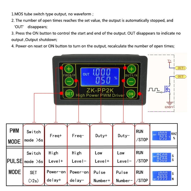 3,2 режим PWM (дисплей имеет «%» для режима PWM) Заводской режим по умолчанию-режим PWM, FREQ + и FREQ-key set частота, DUTY + и DUTY-button set duty cycle; короткое нажатие кнопки Стоп управления выходной сигнал или стоп, стоп-выход 0, sn отображает «OUT» Отметьте, как есть выход, в противном случае он останавливает выход; Заводская частота по умолчанию составляет 1 кГц, а рабочий цикл-50%.